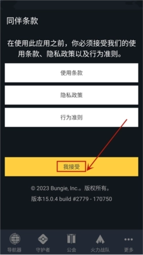 1、在本站下载并安装命运2手机助手后,点击图标进入应用,首次使用前需接受我们的使用条款、隐私政策与行为准则,点击“我接受”即可。