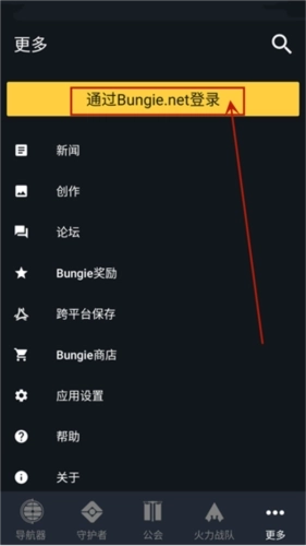 2、打开应用后会自动进入更多页面,点击顶部的按钮,通过Bungie.net完成登录操作。
