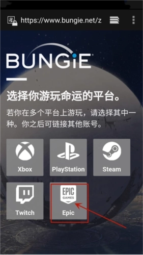 3、Bungie为用户提供了PlayStationNetwork、XboxLive、Steam、Stadia等多个登录平台选项。如果您在多个平台都有游玩记录,可先选择其中一个平台登录,后续再同步关联其他账号。接下来,小编将以Epic平台为例进行说明。