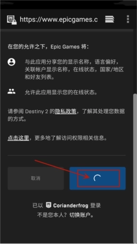 4、点击Epic后,使用EpicGames账户进行登录,登录成功后需点击同意,以通过您的EpicGames账户使用Destiny2。