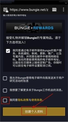 6、创建完成后,在图中所示的位置填写你的电子邮件地址,同意相关使用条款,然后点击“创建个人资料”按钮。