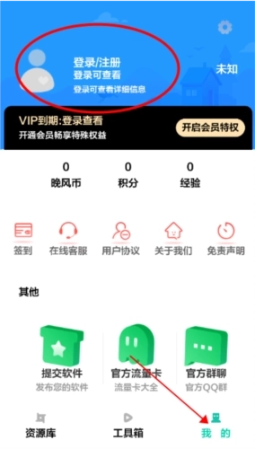 打开晚风工具箱,点击右下角我的,点击登录注册