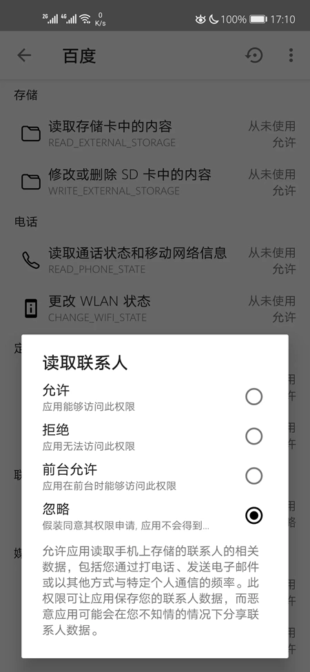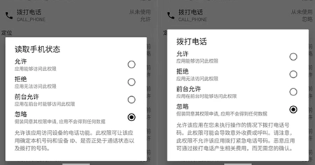2、接着选择你要设置权限的,然后点击权限,例如电话,设置成"忽略" 假装同意权限申请,应用不会获得到任何数据。