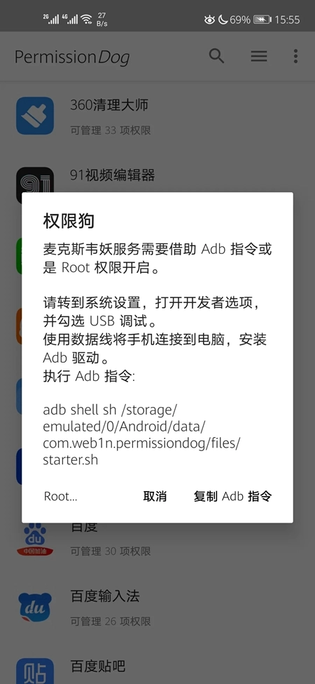 5、操作完成后就可以拔出数据线,打开「权限狗」使用了。但USB调试不能关掉,关掉后会失效。