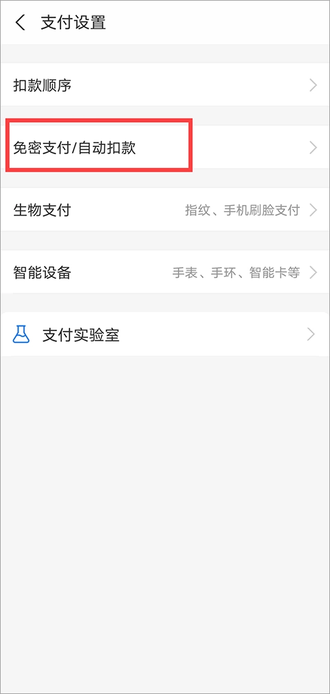 点击【支付设置】,点击【免密支付/自动扣款】。