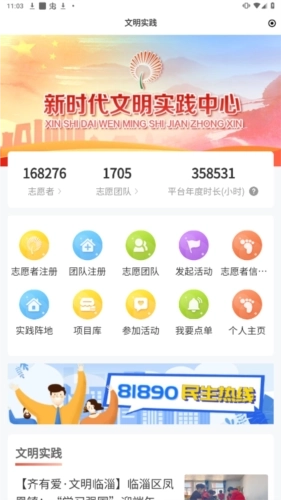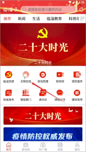 1、在本站下载临淄云客户端并安装打开,在首页找到“文明实践”功能入口点击进入;