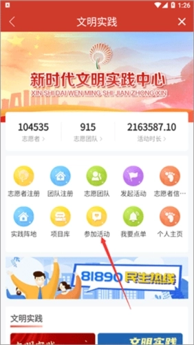 2、进入“文明实践”页面后,我们可以进行加入志愿团队、发起志愿活动、参与志愿活动等操作。
