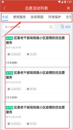 3、点击“参加活动”按钮后,页面将跳转至活动列表页面。在该页面中,用户不仅可以浏览所有志愿活动的信息,还能依据自身需求筛选不同的志愿活动类型。