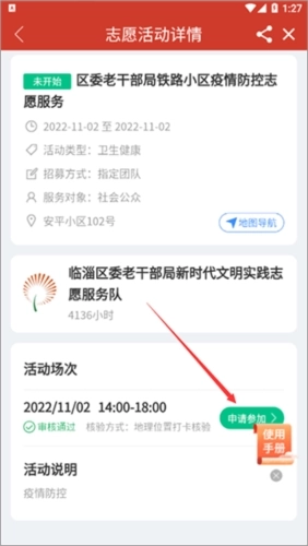 4、选择你想报名参与的志愿活动,即可查看活动类型、招募方式、服务对象及活动说明等信息,若确定参加,点击“申请参加”即可。