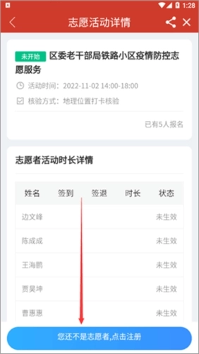 5、最后会再次确认报名情况,若还不是志愿者,需先注册成为志愿者。(已报名的志愿者请在活动时间内前往指定地点打卡核验,非必要情况下请尽量不要缺席)