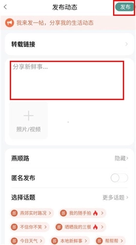 4、输入要分享的内容,还能添加视频或照片,选好对应的话题标签后,点击发布按钮就完成操作了。