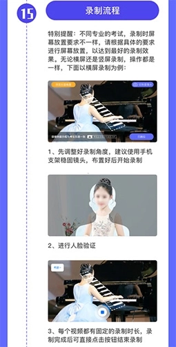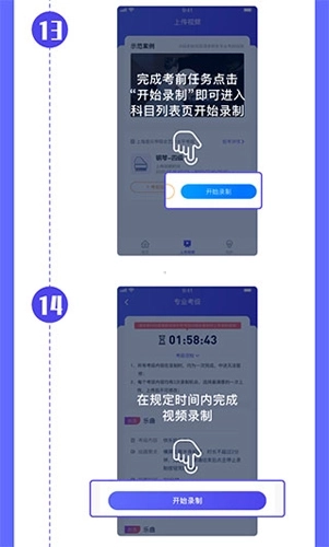 8、特别提醒:不同专业的考试,录制时屏幕放置要求不一样,请根据具体的要求进行屏幕放置,以达到最好的录制效果。无论横屏还是竖屏录制,操作都是一样的,下面以横屏录制为例:先调整好录制角度,建议使用手机支架稳固镜头,布置好后开始录制。然后进行人脸验证,每个视频都有固定的录制时长,录制完成后可直接点击按钮结束录制。