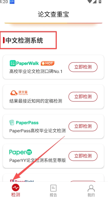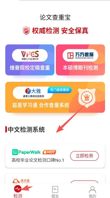 1、进入论文查重宝的检测栏目,上传待查重的论文,在中文检测系统中选定对应的查重方式后,点击立即检测即可。