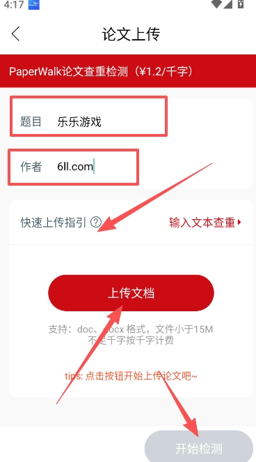 4、输入标题、作者信息,查看文档快速上传指引后,即可开始检测。