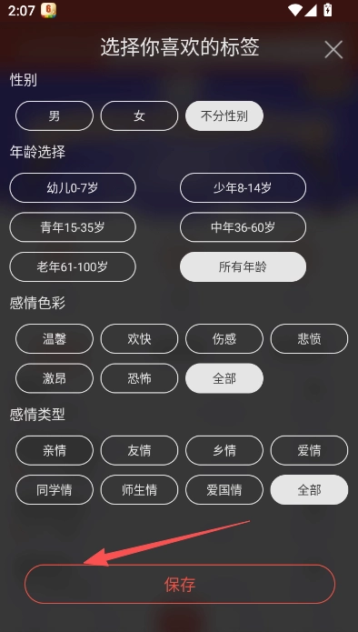 2、在注册用户账户正式登录前,请选择你感兴趣的诗词朗诵相关标签。