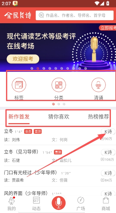 1、K诗模式:提供配乐朗诵和清诵两种模式,能适配不同用户的录制喜好。