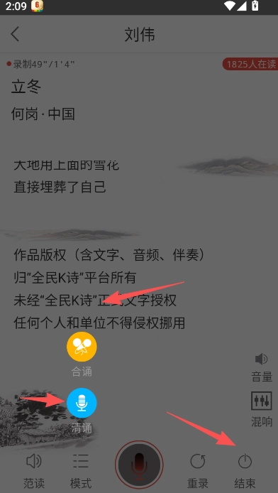 5、挑选合诵、清诵的形式录制诗词,录制完成后点击结束并发布。