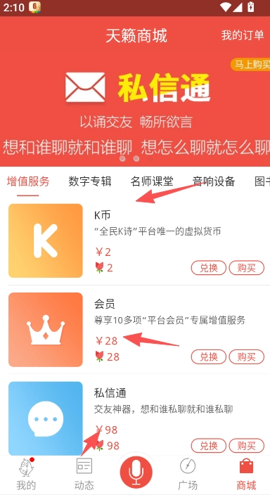1、全民K诗的收费项目主要包含k币、会员和私信通三类,其中k币用于平台虚拟物品的购买,会员服务提供各类增值权益,私信通则支持用户之间的交友私聊功能。