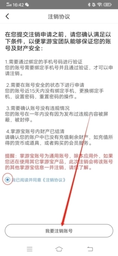 3、仔细阅读注销协议,在确认内容无误后,勾选“我同意”选项,接着点击下方的“我要注销账号”按钮;