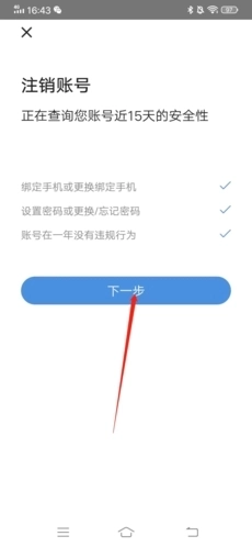 5、确认注销账号的安全性没有问题后,继续点击“下一步”;