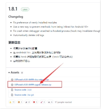 5、在GitHub的LSPosed仓库里,找到箭头所指的LSPosed-Zygisk版本模块;接着在Magisk框架中点击【本地安装】,完成该LSPosed模块的安装操作。