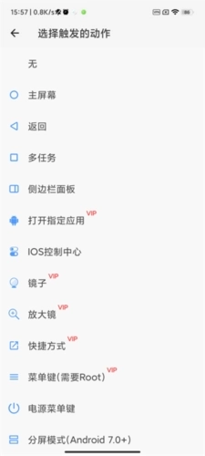 3、选择该动作所触发的功能,涵盖返回、镜子、放大镜和快捷方式等选项。