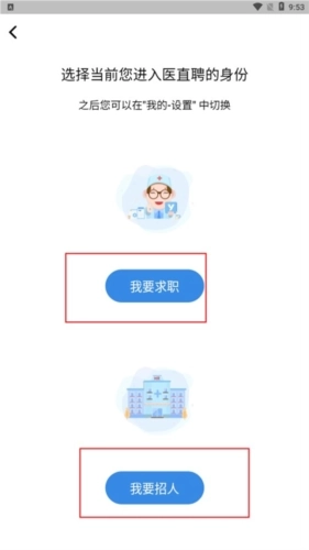 2、用户可以选择自己的身份,求职或者招聘都可以登陆该软件。