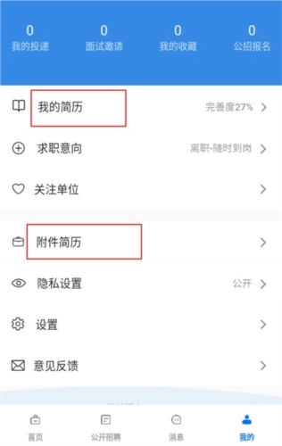 9、点击进入我的,用户可以在这里完善自己的简历信息,上传附件简历。