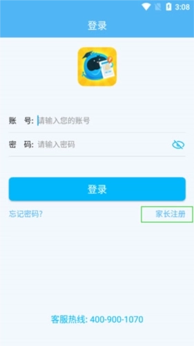 1、首先打开登录界面,会看到登录按钮下方有“家长注册”的小字提示,点击该提示进行注册。