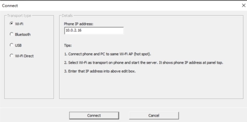 在连接对话框里,选择Wi-Fi作为传输方式,再输入电话的IP地址。