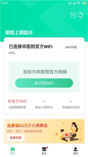 1、用户打开医院上网助手,登录并进入首页后,点击首页上的“去识别医院WiFi”选项。