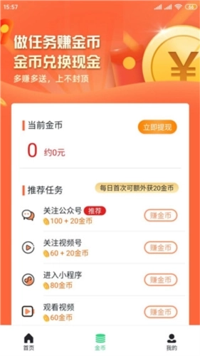 2、点击金币图标即可参与任务赚取金币,当金币积累到特定数量后,就能申请提现啦。