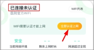 3、在认证页面,用户需确认已连接医院WiFi,然后点击“立即认证上网”按钮。