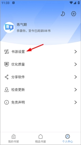 2、在个人中心页面,用户可进行阅读设置、优化书籍质量,还能点击书源设置。