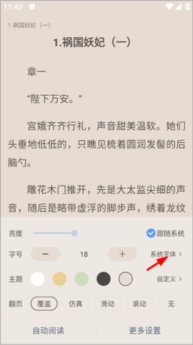 3、在设置里开启阅读亮度、字号、主题和翻页模式等功能,然后点击系统字体;
