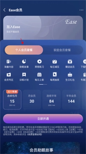 2、届时可看到两种套餐服务,其中个人会员套餐选择连续包月的方式,每月需支付15元,且支持立即开通。
