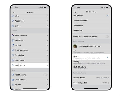 开启智能通知后,Spark为您智能过滤邮件通知,只在接收重要邮件时提醒您。所有营销短信、通知和其他不相关的垃圾都会被默默送至收件箱,所以您不必担心手机会在您忙碌时嗡嗡作响。只需轻触几下,您就可以开启“智能通知”屏蔽骚扰邮件,还您清净空间。以上都是以单个账号为单位设置的,您可以轻松配置符合自己需求的设置。