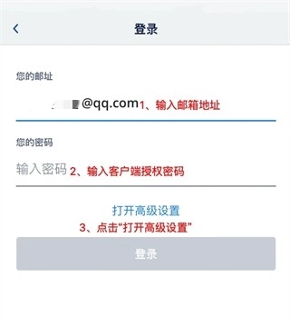 4、输入邮箱账号和授权密码,点击高级设置,这个才是关键。