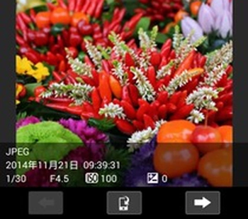5、在CameraConnect里点击“相机上的图像”,手机会显示相机内存中所有照片的缩略图,点击自己需要保存的图片,点击右上角的“i”可以显示照片的详细信息,点击下方左边的图标会自动保存图片到手机上。这样,我们想要把相机照片无线传输到手机上的任务就完成了。