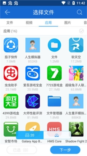 4、滑动上方的菜单项,选择发送文件的类型“联系人、应用、图片、音乐、视频等”。