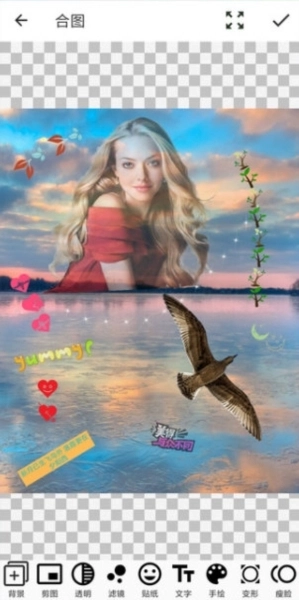 7、合图功能:将抠取的图像与背景进行叠加,合成全新图片,支持更换图片、背景、人像及头像。同时可对图片进行滤镜调整、添加贴纸与文字、手绘创作、设置透明效果、更换背景图或背景色,以及进行PS变形拉伸等操作。
