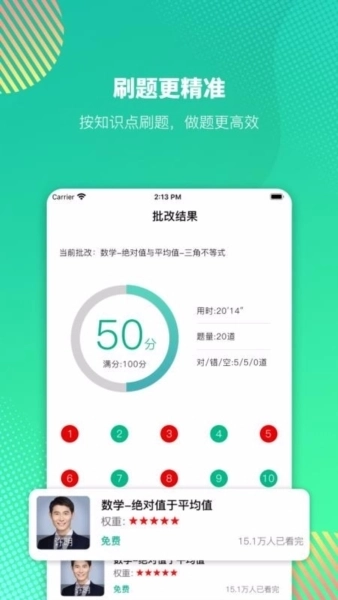 1.学练结合:用户可在观看视频后立即检测学习成效,针对错题能反复练习,还能观看对应的讲解视频。