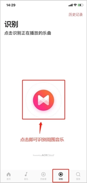 点击「识别」界面后,再次点击「识别」按钮,就能识别出周围正在播放的音乐。