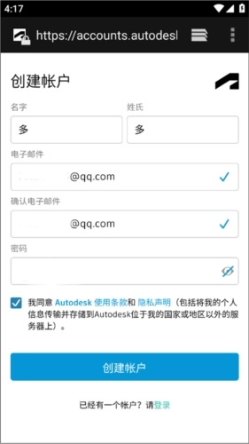 1、在本站免费获取该软件,安装完成后打开。若你已有AutoCAD账号,直接登录即可;若没有,则需创建一个账号。创建账号的操作十分简单,只需输入名字、姓氏、电子邮件和密码,点击创建按钮就能完成。