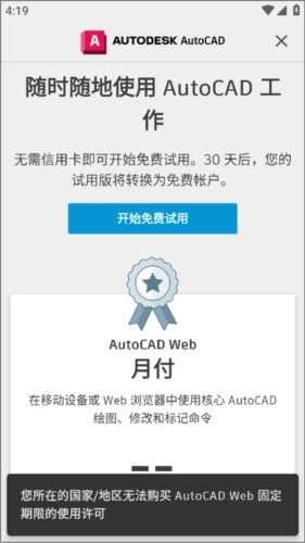 2、进入软件后,能看到有30天免费试用,用户完全无需担心购买后觉得不好用的问题,这款软件的主要功能是在移动设备或web浏览器中使用核心autocad绘图、修改与标记命令。