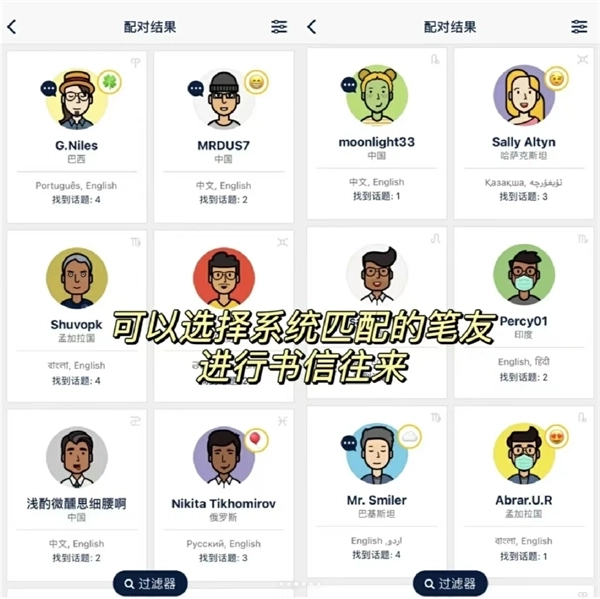 根据共同兴趣和语言寻找朋友。