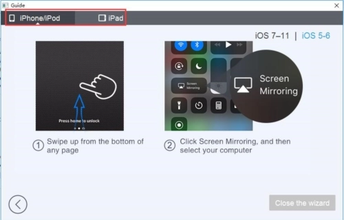 4、在界面上方可选择具体的苹果设备类型(此处以iPhone、iPod为例,iPad可通过相同方法查看)。比如图中展示的是iOS7-11版本的iPhone或iPod进行投影操作时所需的步骤。