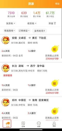 1、货源页面:此页面包含多条路线,用户需通过竞价的方式获取对应路线的经营权。