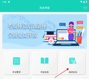 1、在央音考级首页点击“成绩查询”;