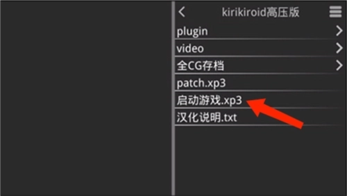 5、包含plugim、video、全CG存档、patch.xp3、启动游戏.xp3以及汉化说明等选项,从中选择【启动游戏】这一选项,